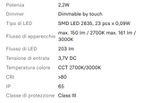 Lampada da tavolo ricaricabile per interni ed esterni equipaggiata con LED SMD, interruttore ON/OFF, dimmer da 100% - 5%, con memoria dell’intensità luminosa e temperatura colore, possibilità di cambiare la temperatura colore da 2700K a 3000K. Dotata di caricatore a contatto completo di 1,5m di cavo USB e adattatore. Tempo di ricarica completa 6 ore, durata di funzionamento al massimo carico (a luce massima) 9 ore. Corpo in pressofusione di alluminio verniciato in 5 colori.