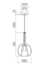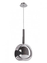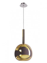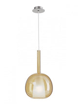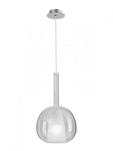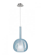 Sospensione per interni, diam. 20cm. Struttura in metallo cromato, cavo trasparente 2,5 metri, diffusore in vetro borosilicato soffiato: trasparente, azzurro chiaro, verde chiaro, ambra, oro specchiato, rame specchiato o fumè specchiato. La parte interna è in vetro satinato. Portalampade E27